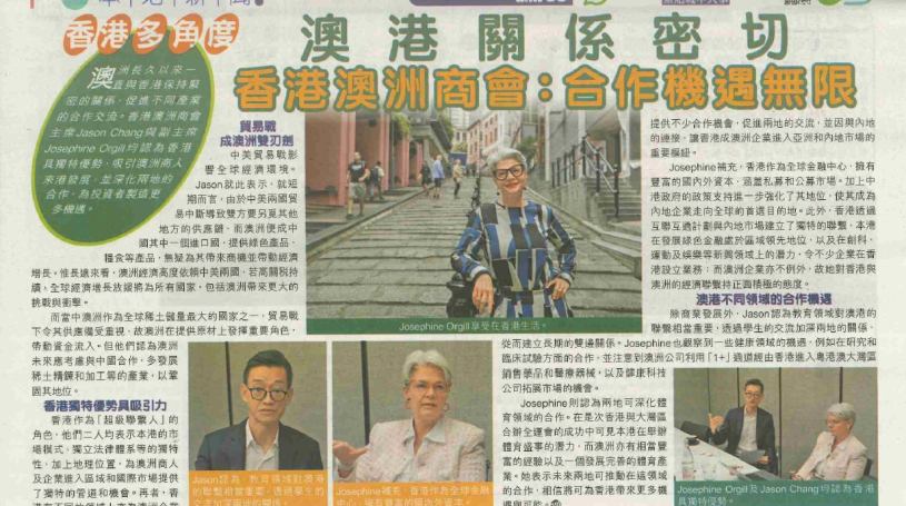 Australia has long maintained close ties with Hong Kong, promoting cooperation and exchange across various industries. Jason Chang, Chairman of the Australian Chamber of Commerce in Hong Kong “AustCham”, and Josephine Orgill, Vice Chairman, both believe that Hong Kong has unique advantages, attracting Australian businesses to develop in Hong Kong and deepening cooperation between the two places, creating more opportunities for investors.